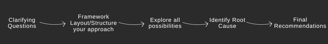 Explore all possibilities and find the root cause: After laying out a framework, you have to focus on one segment at a time and explore all possibilities with the interviewer until you identify the root cause. At this step, most people get worried about not finding the solution while going through each segment one by one. Remember to have trust in the process. It will always lead you to the right answer. Keep in mind that the RCA interview is always a collaborative discussion; always keep looking for hints from the interviewer. They will often help you skip segments which are not relevant.